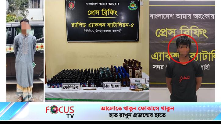 র্যাব-৫ এর পৃথক পৃথক অভিযানে দুইজন অভিযুক্তকে আটক করেছে। স্ত্রীকে হত্যার দায়ে একজন এবং অপরজনকে মাদকসহ আটক করে র্যাব। শনিবার এক সংবাদ বিজ্ঞপ্তিতের মাধ্যমে জানা যায়, চাঁপাইনবাবগঞ্জ থেকে বিদেশী মদ ও ফেন্সিডিলসহ জিহাদ আলী গ্রেফতার হয়। হত্যা মামলার পলাতক আসামী আশিকুর রহমান রাজশাহীর রাজপাড়া থানা এলাকা থেকে গ্রেফতার করা হয়। উভয়ের বিরুদ্ধে আইনগত ব্যবস্থা নেওয়া হয়েছে।