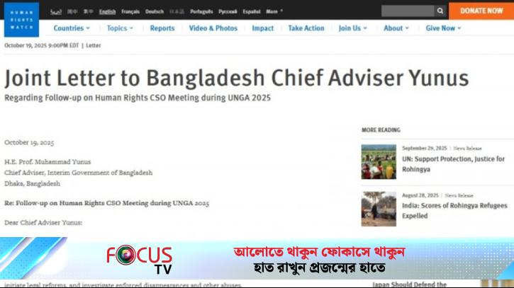 রবিবার (১৯ অক্টোবর) যুক্তরাষ্ট্রভিত্তিক সংস্থা হিউম্যান রাইটস ওয়াচ (এইচআরডব্লিউ)-এর ওয়েবসাইটে চিঠিটি প্রকাশ করা হয়। এতে স্বাক্ষর করেছে হিউম্যান রাইটস ওয়াচ, কমিটি টু প্রটেক্ট জার্নালিস্টস (সিপিজে), সিভিকাস, ফোরটিফাই রাইটস, রবার্ট এফ কেনেডি হিউম্যান রাইটস ও টেক গ্লোবাল ইনস্টিটিউট।
